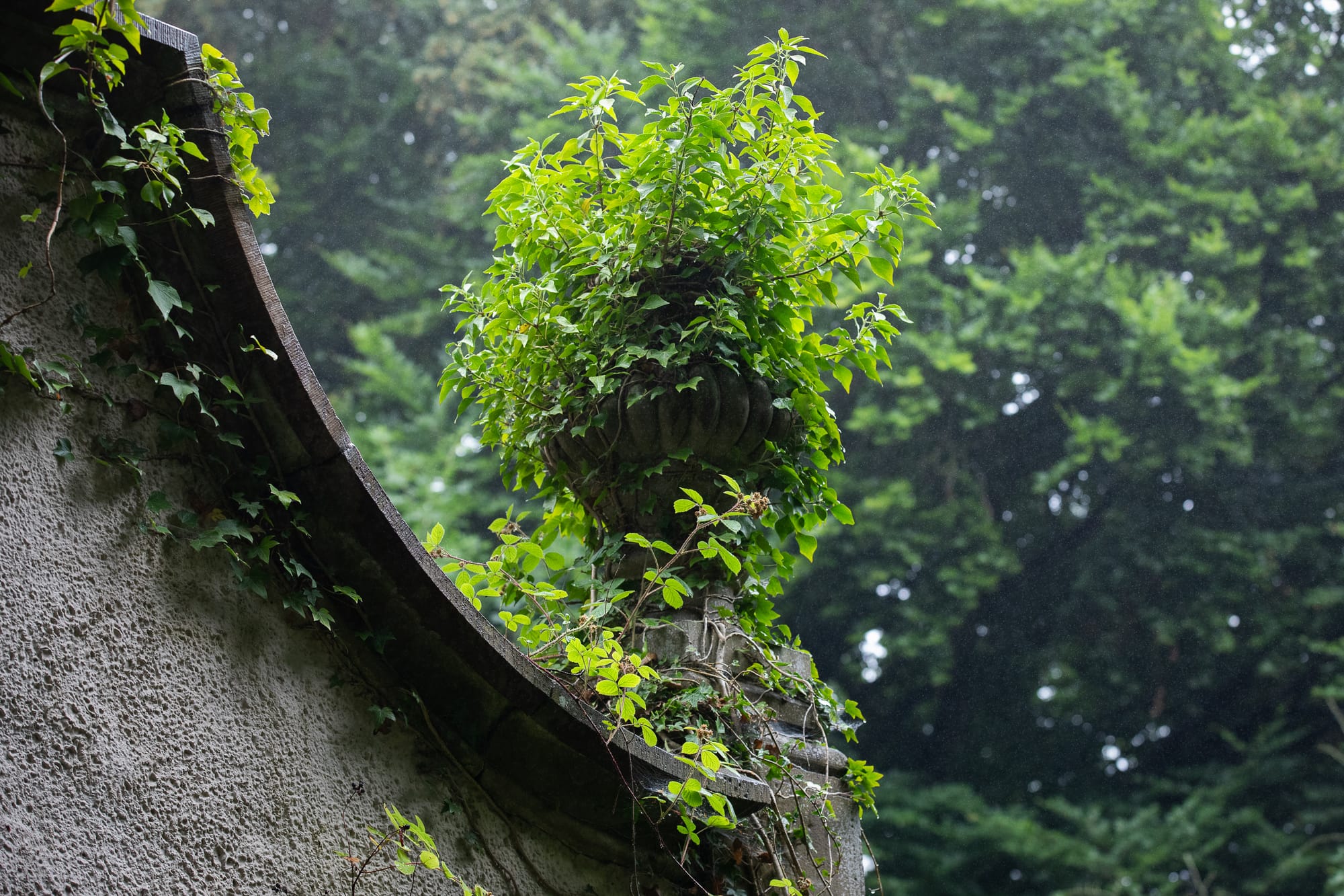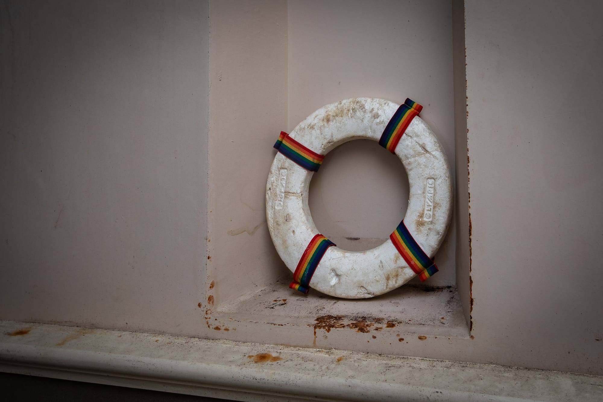 When we finally get some light in, the ghosts of the past can be seen everywhere. A heraldic crest is painted on one wall (Pie Repone Te — “rest in pious confidence”) while a polystyrene life buoy ring perches on another just in case the pool ever fills up again. Outside, it looks like the building itself is slowly being absorbed back into nature with vines covering the walls.