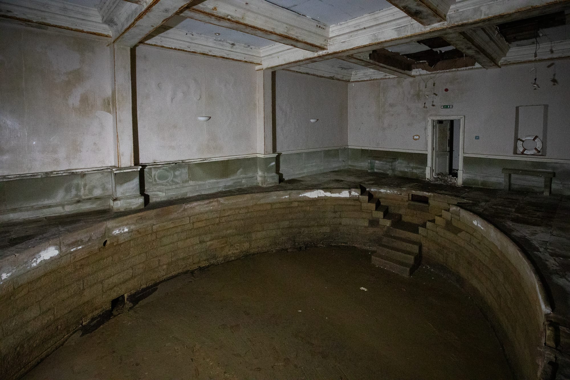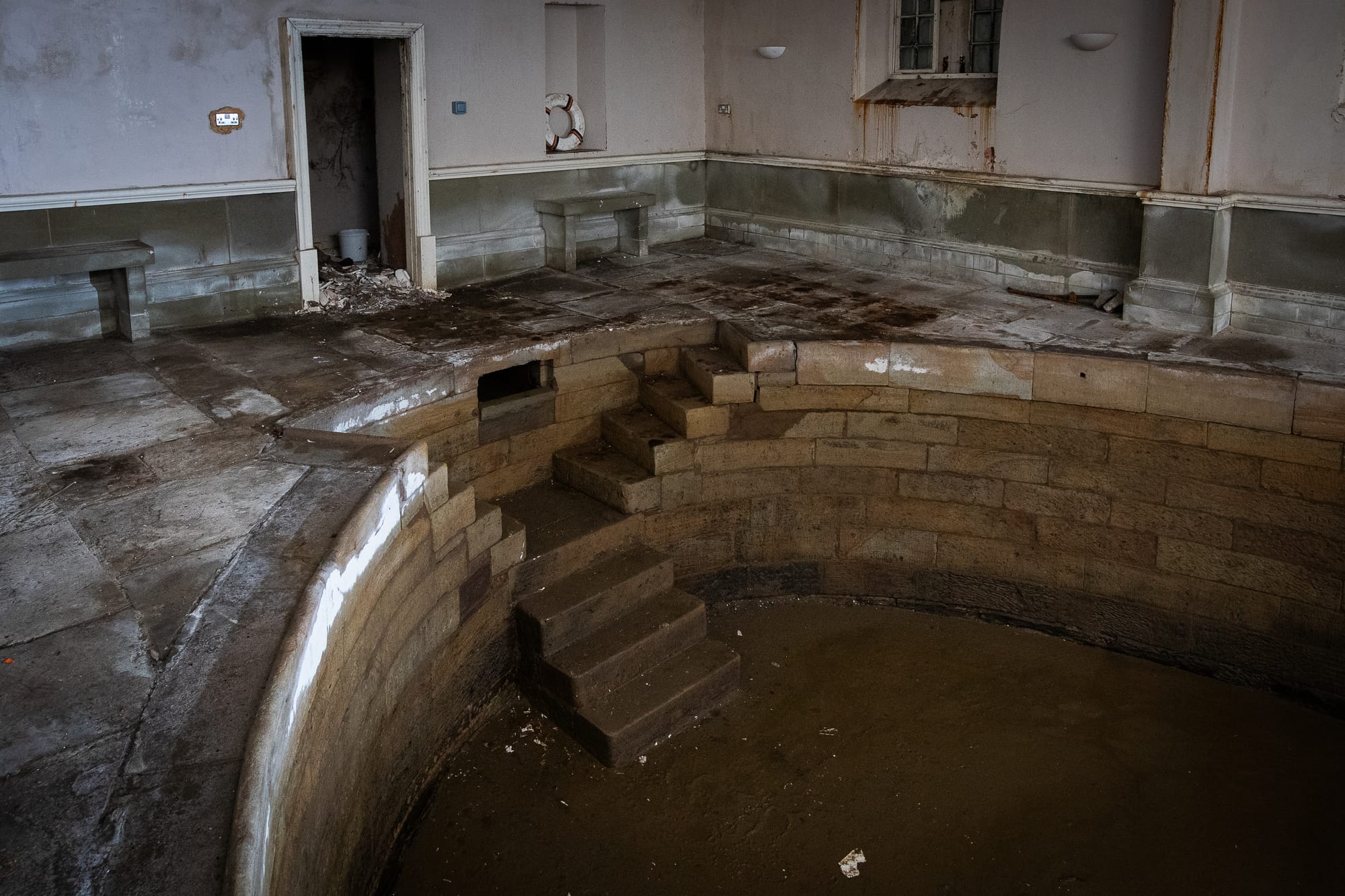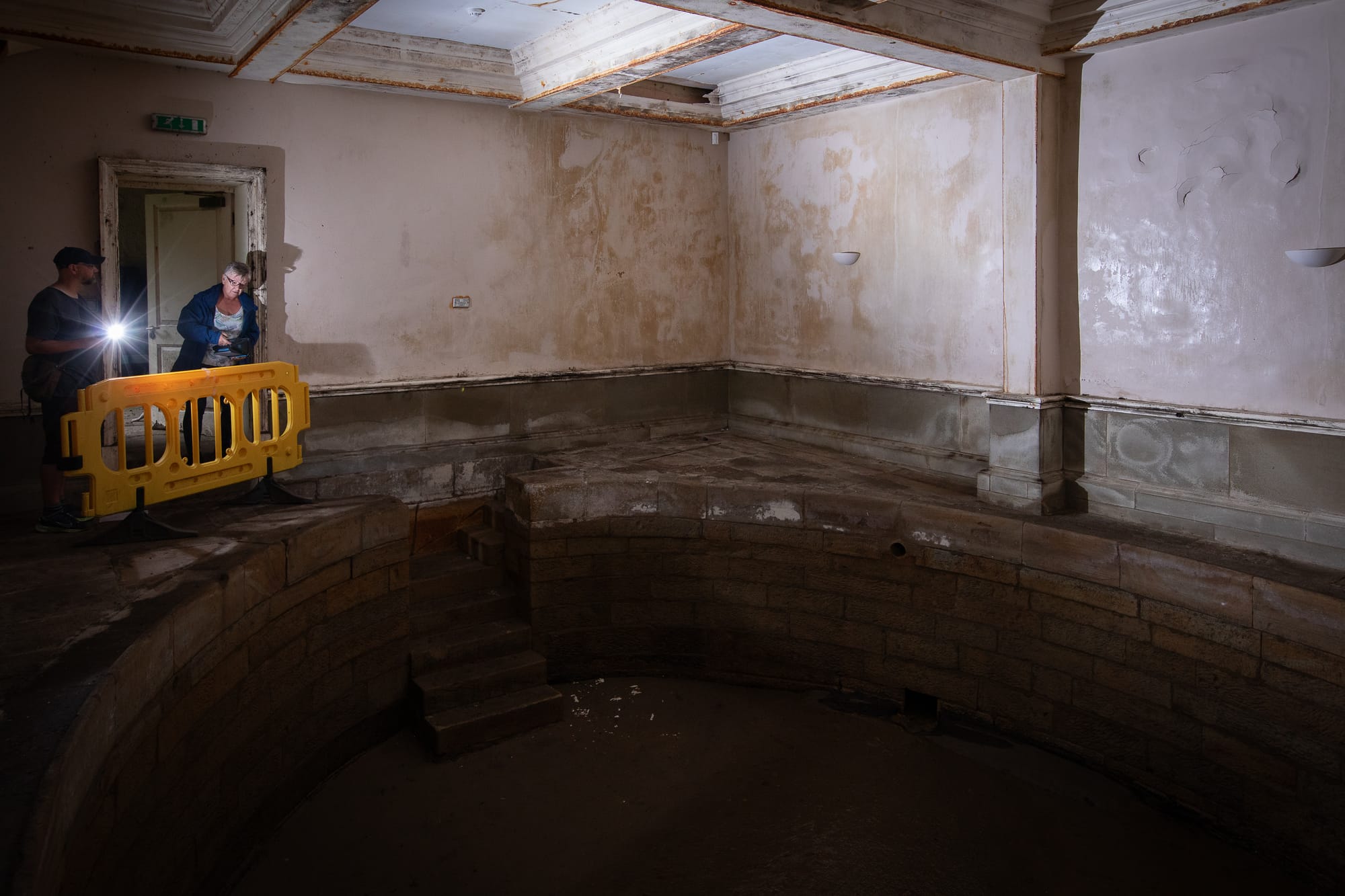 The pool room, though, is perhaps even stranger. I can smell the damp, and hear the sound of running water — but the pool itself is an empty void. It used to capture the water from the spring to fill it up, and even a year ago it was full of fresh water. But Fiona tells me that the old rubber plug disintegrated, meaning that the spring now just runs into the plunge pool, down the gently sloping bottom, and out the other side.