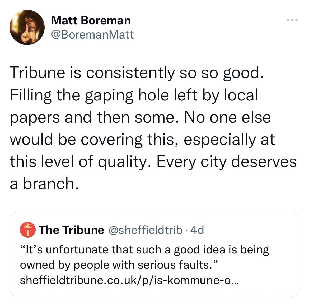 We’ve been getting loads of great reaction to our weekend story about Kommune over the last few days. Victoria’s piece was read by more than 35,000 people and led to 11 more readers signing up as members. It also produced some lovely tweets including this one from long-time Tribune subscriber Matt Boreman.