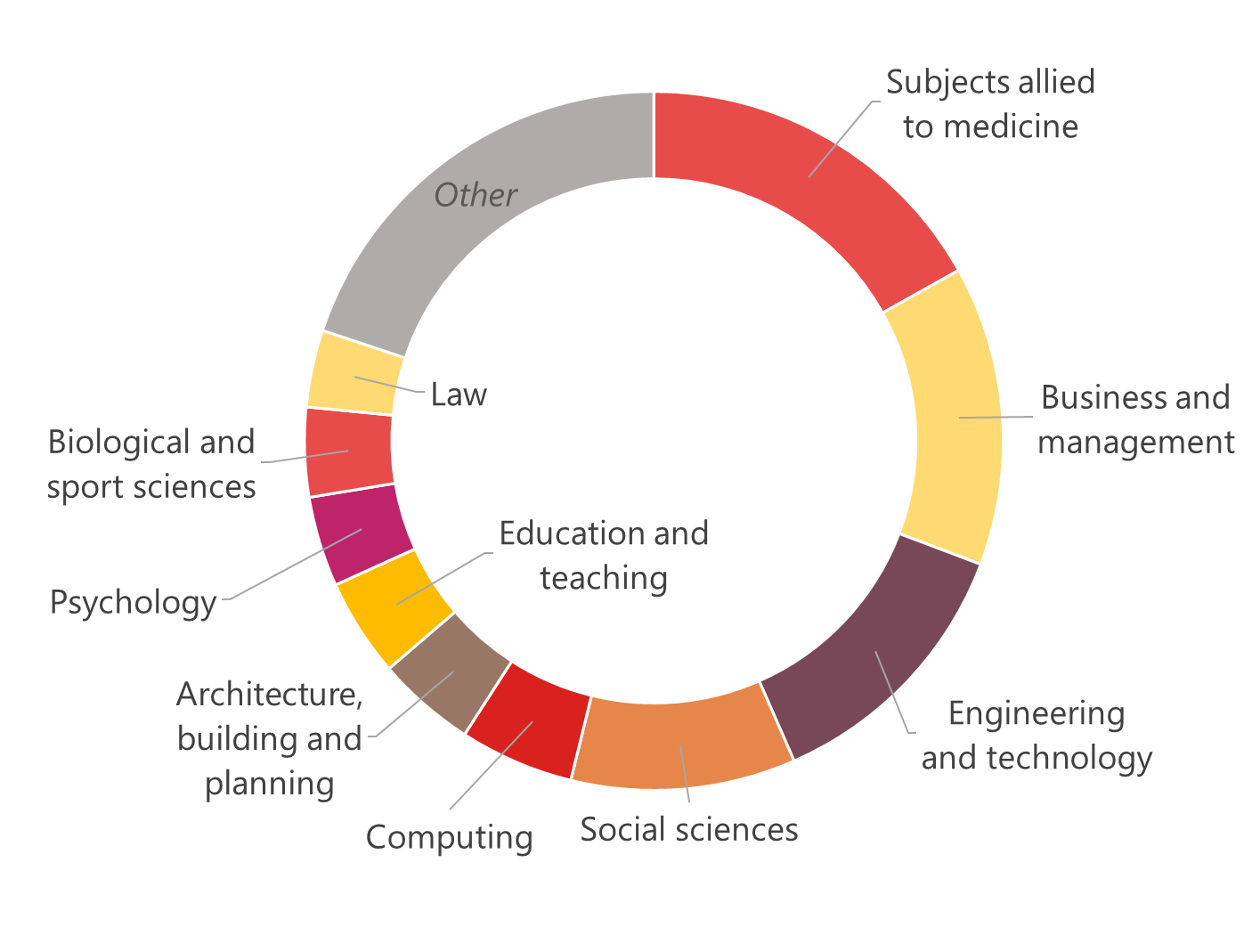 But some of the traditional subjects are losing out. Both maths and the physical sciences (which includes physics and chemistry) had fewer than 1,000 students in Sheffield during the last year we have data for. That’s despite a nationwide push for more STEM graduates. Sheffield is also notable for the complete lack of veterinary training on offer — neither of our main universities are training vets.