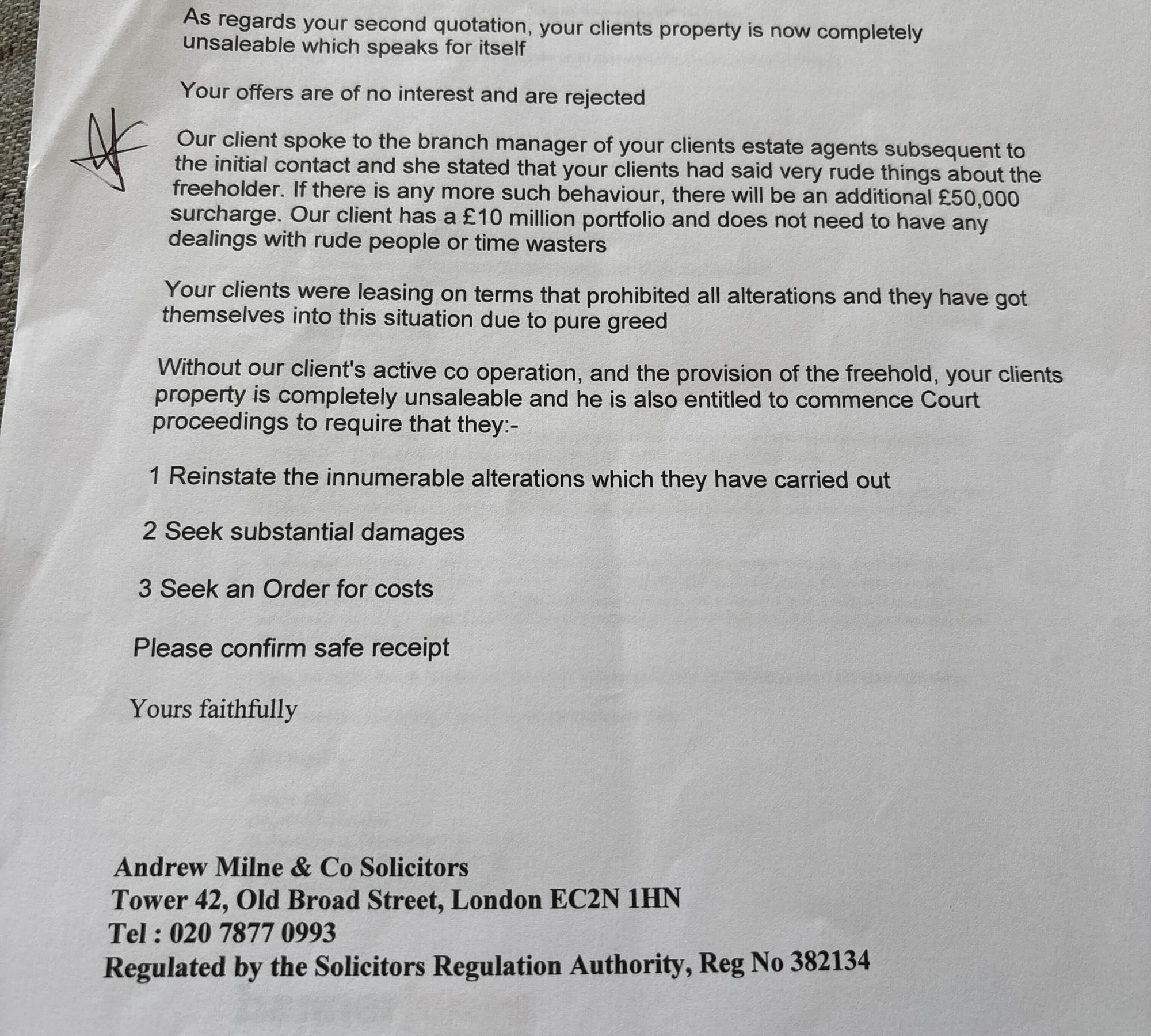 A single page of one of Milne’s multiple letters shows the kind of aggressive communication Denise was subject to. Responding to a compromise offer that Denise had made via her solicitors, Milne said that: “your client’s property is now completely unsaleable… Your offers are of no interest and are rejected.”