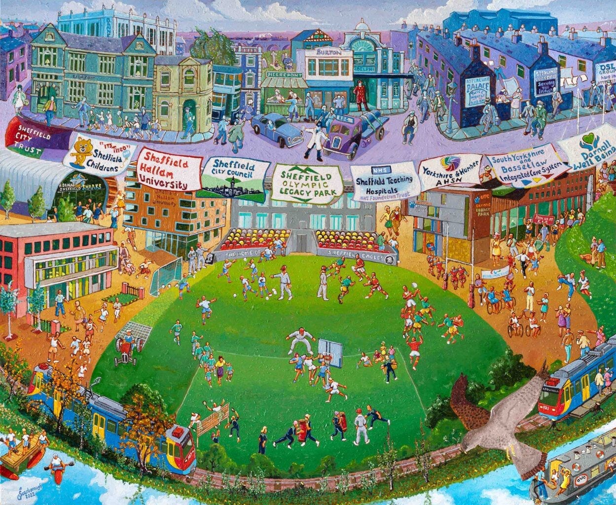 A new painting by much-loved Sheffield artist Joe Scarborough was last week unveiled at the Olympic Legacy Park in Attercliffe. The painting, which shows both the historic past and bright future of the former industrial neighbourhood, is currently on public display at the Advanced Wellbeing Research Centre.
