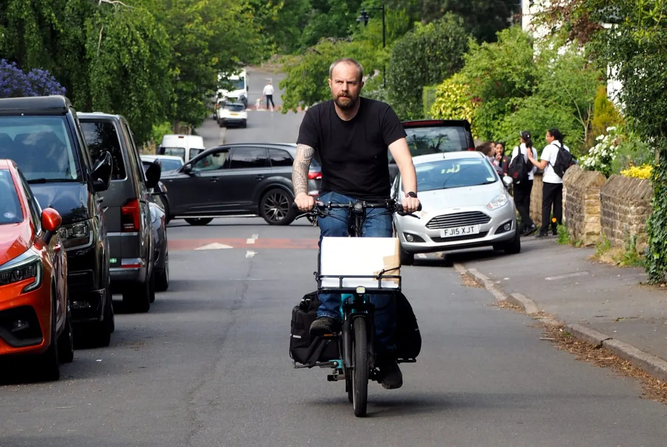 Russell Cutts climbing a Nether Edge hill on his e-cargo bike.