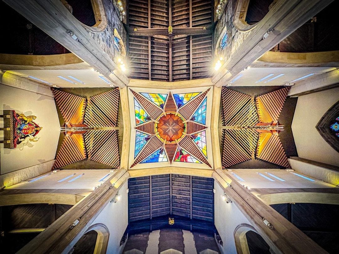 Thanks to Robert Gale for letting us use his great photo of the magnificent lantern tower at Sheffield Cathedral. The tower itself was added when the west end of the building’s nave was redesigned in the 1960s, but the beautiful stained glass was updated to its current design in 1998.