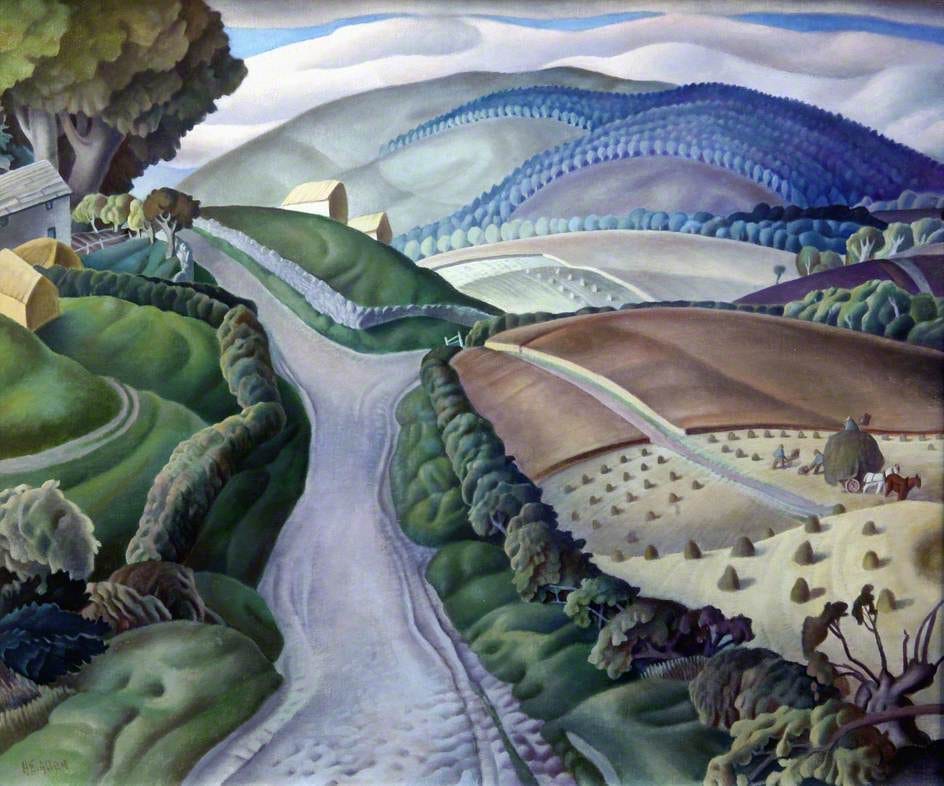 Looking at his paintings now, the influence of modernism in the repeated patterns and stylised lines is clear. In the early 1940s he was invited to write six articles for The Artist magazine in which he elaborated on his technique and aesthetics. He wrote that the artist is primarily concerned “with rhythm and design, and our colour must be employed for the purpose of reinforcing these fundamentals, and strengthening form”. He continued: