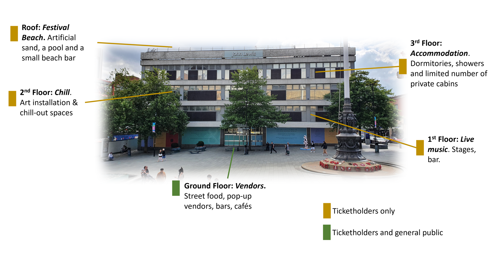 - An interesting piece on Sheffield blogger Peter Johnson’s website about his ideas for the future of the former John Lewis building. He thinks it should be made into what he calls a “festihotel” or a “space to break the rules of modern life”. The ambitious plans would see the ground floor be given up to street food, bars and cafes, while the first and second floors would be arts spaces and the third floor accommodation. This would all be topped off with an artificial beach, bar and pool on the roof. Where do I sign up?