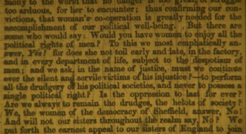 The “little band”, as Abiah once referred to it, first met three months ago. They’ve been working towards tonight, when the WRA unanimously adopts the first manifesto calling for female suffrage in Britain. The women address it to ‘the women of England — beloved sisters’ and say that they, “the women of the democracy of Sheffield”, have, for years, seen plans, systems and organisations put in place to improve people’s lives and, they argue, women should be included.