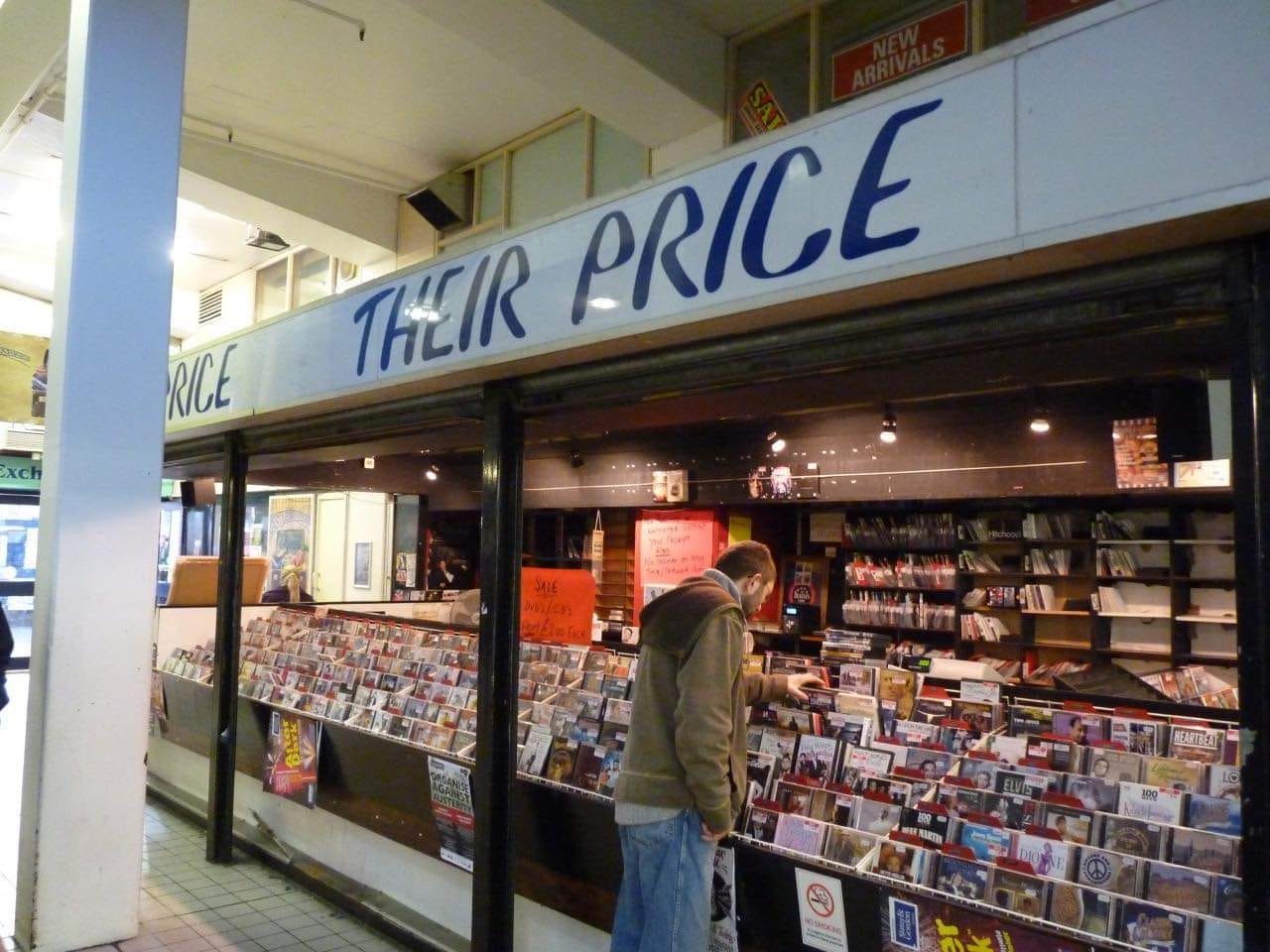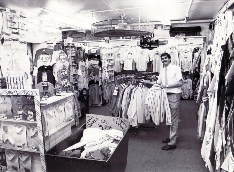 K&D stood between Harrington’s Menswear and the entrance to the market so standing in the record shop you could feel like a figurehead in the fish market’s frosty crosswinds. Catering for teenagers, Harrington’s speciality brand names crowded the racks: Stay Press trousers and Y-cardigans were a staple, but there was a spate of daft names for cheaper brands of jeans, like ‘Godric’ (which patrons called Go Dereks) or ‘Karibou baggies’. The owner, Brian, ran a local ad where he had a drawn-on crown and Harrington’s had a mezzanine-level changing room which I hear was great if you were robbing. Now, when you search for photos of the place, it looks like an elaborate on-boarding set-up for a VR fashion experience.