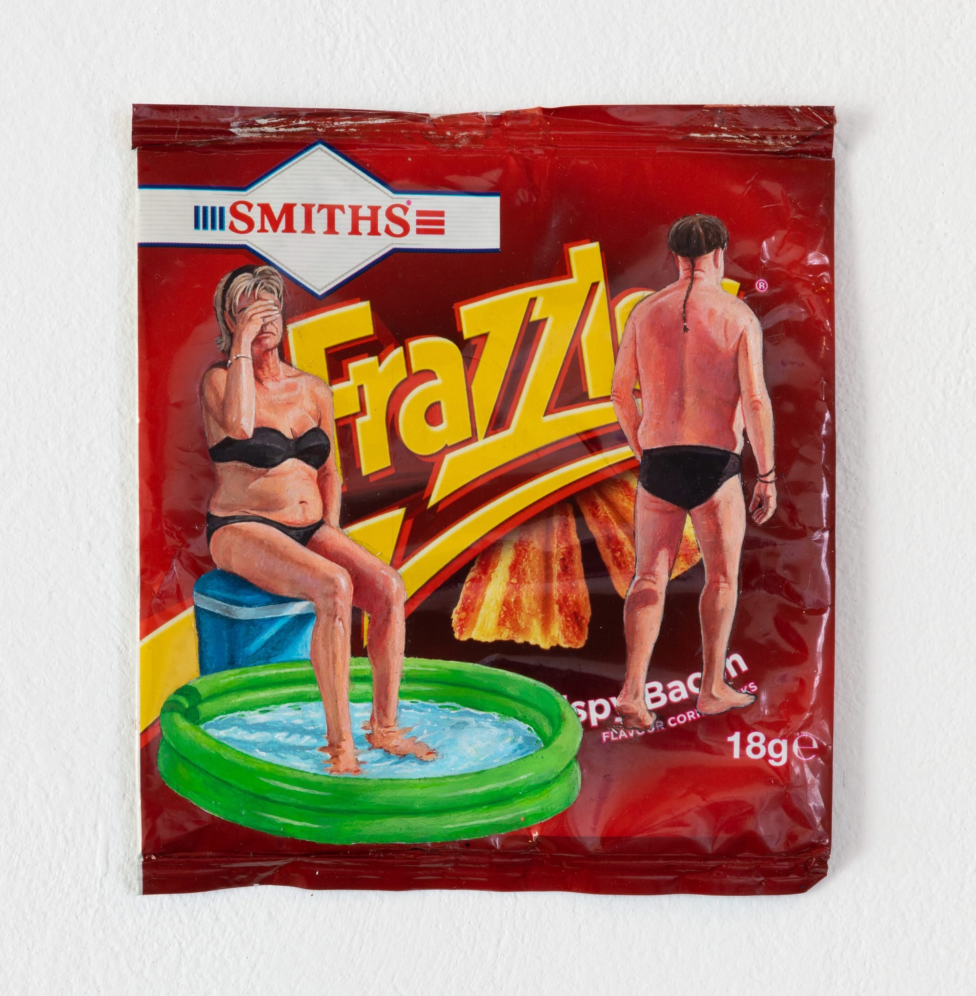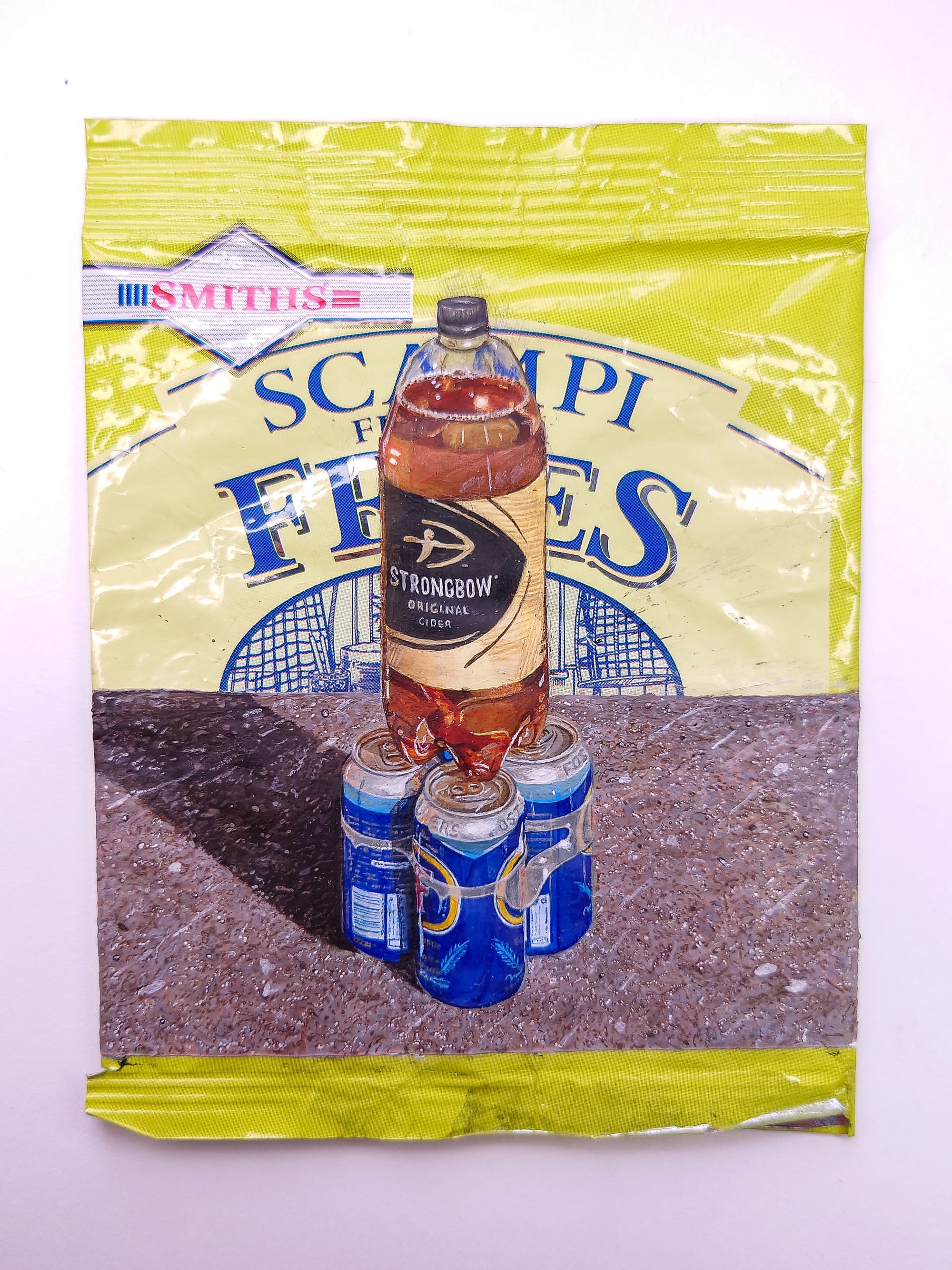 “I’m not just trying to display poverty porn, it’s far from that,” he insists. He mentions one painting of a bottle of Strongbow and a four-pack of Foster’s painted onto a packet of Scampi Fries as an example of something that could be misinterpreted. “The painting of the cider bottle is pure joy to me,” he says. “Where to someone else on the outside — it's scummy. To me, it’s memories, fun nights and conversations, and people that are attached to that object.”