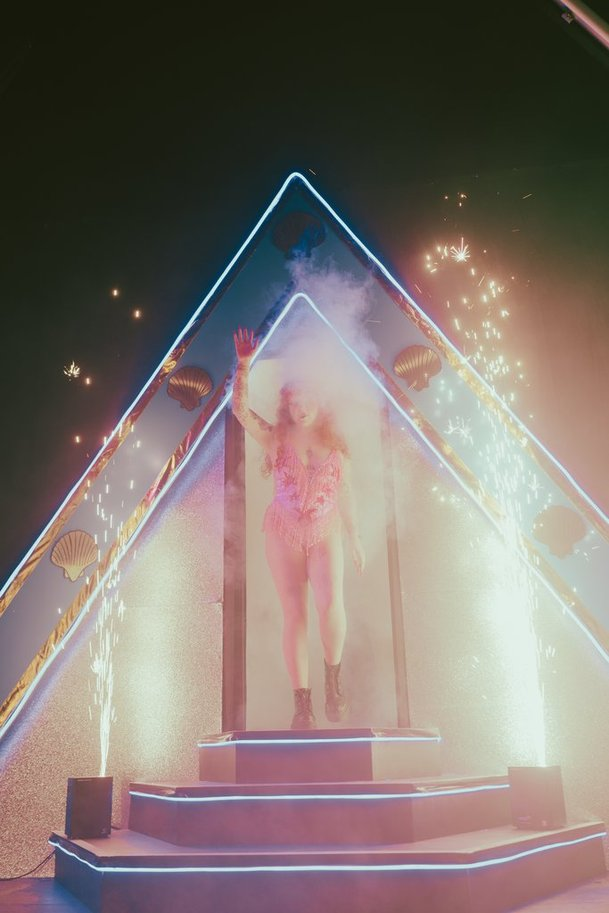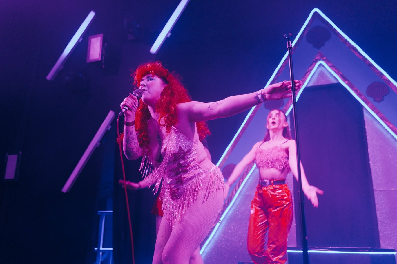 All the Clams contestants have had a run-through onstage, and are waiting as the crowd begins to arrive. Once the show starts, they’ll be in the audience looking like the rest of us. But beneath their clothes, each wears as much of their final ‘reveal’ costume as they can – after they’re called out of the crowd and introduced, they’ll only have a few minutes backstage to transform into their chosen star. So beneath a pink skirt, anti-fascist T-shirt and a green fluffy jacket – Beth’s regular clothes are pretty dopamine-inducing themselves – she’s secretly wearing a spangly hot-pink leotard sourced from Easy Tiger, the brand that Roan herself wears. And just as I’m interviewing her, one of the hundreds of sequins that encrust her leotard gets snagged in the mesh of her sparkly fishnet tights.