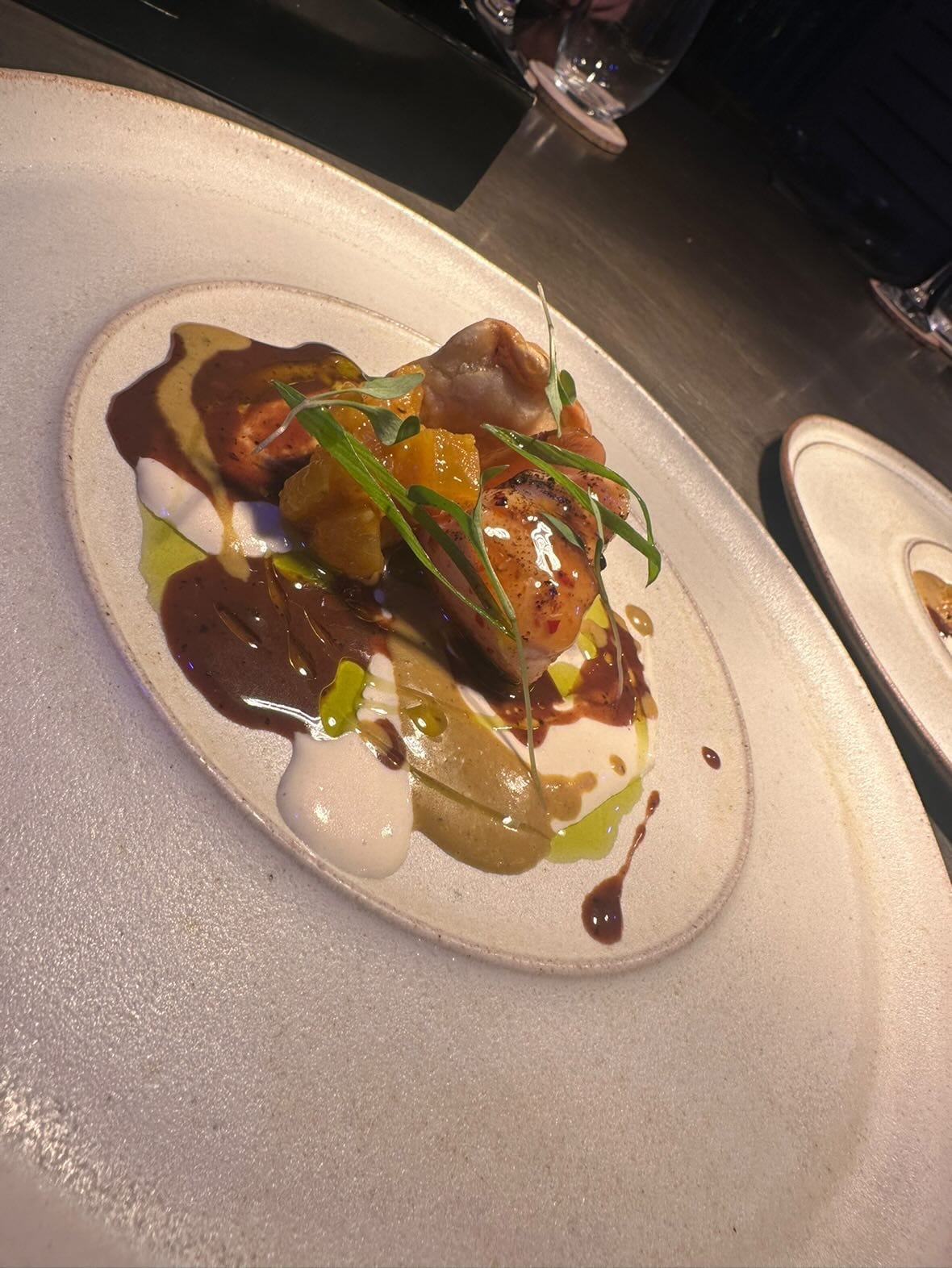 In terms of my food, the first course of focaccia was beautifully crisp and the second course of potato, wild garlic and yeast felt like it could well have been devised as a vegan meal from the outset (the only addition in Martin’s version was trout roe). But after the first few courses, the gamey meat on Martin’s plates was replaced on mine by an assortment of vegetables — carrot, fennel, red cabbage, onion — which felt like uncreative substitutes to meet a dietary requirement. That’s probably what they were. By the time the dessert courses came, I was wilting.