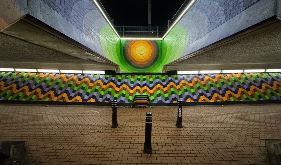 If you haven't seen Sheffield street artist Rob Lee’s now finished mural in the underpass near the Netherthorpe tram stop, then try to make a detour to take a look. It has taken him a while. Lee started painting the mural back in September during the Lick of Paint festival, and finally completed it in early December. Full of Lee’s trademark geometric abstractions, it’s a fantastic new piece of public art.