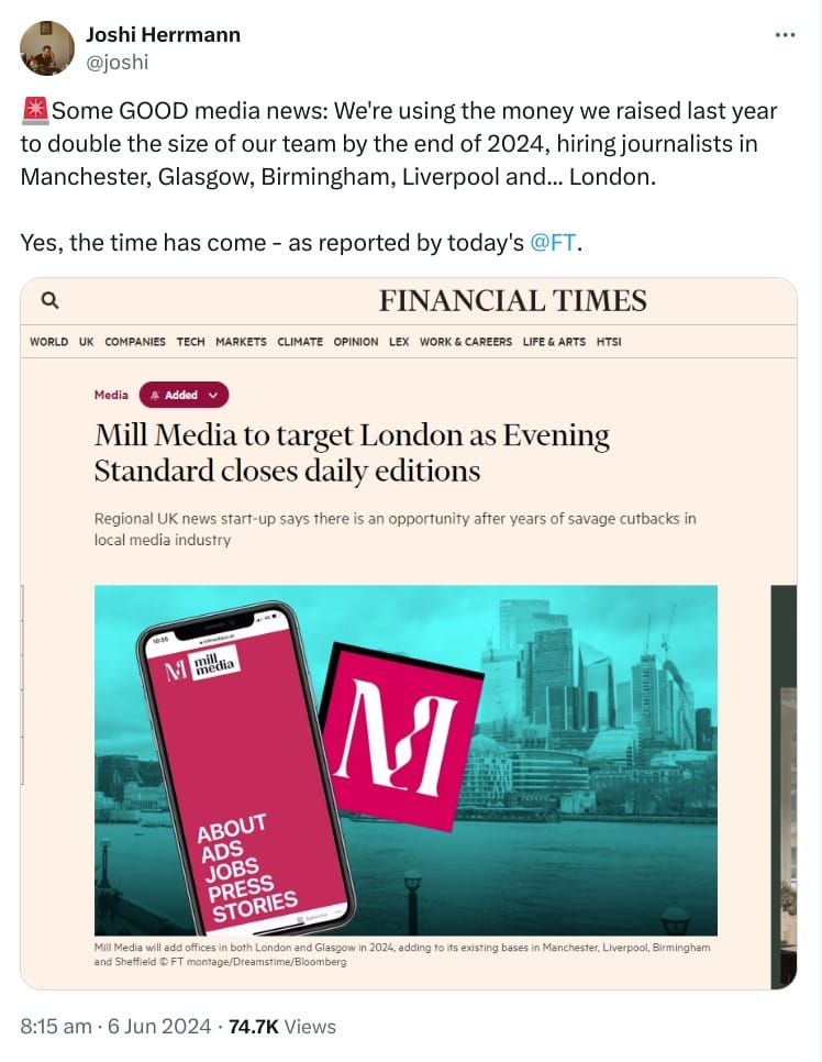Some good news for anyone rooting for Mill Media (that’s our parent company! So hopefully you). In an era of endless layoffs, we are hiring. The plan is to double the size of our operations by the end of the year by hiring writers, editors, an advertising sales manager and a social and video producer. This has been covered by no less august an institution than the Financial Times this morning: