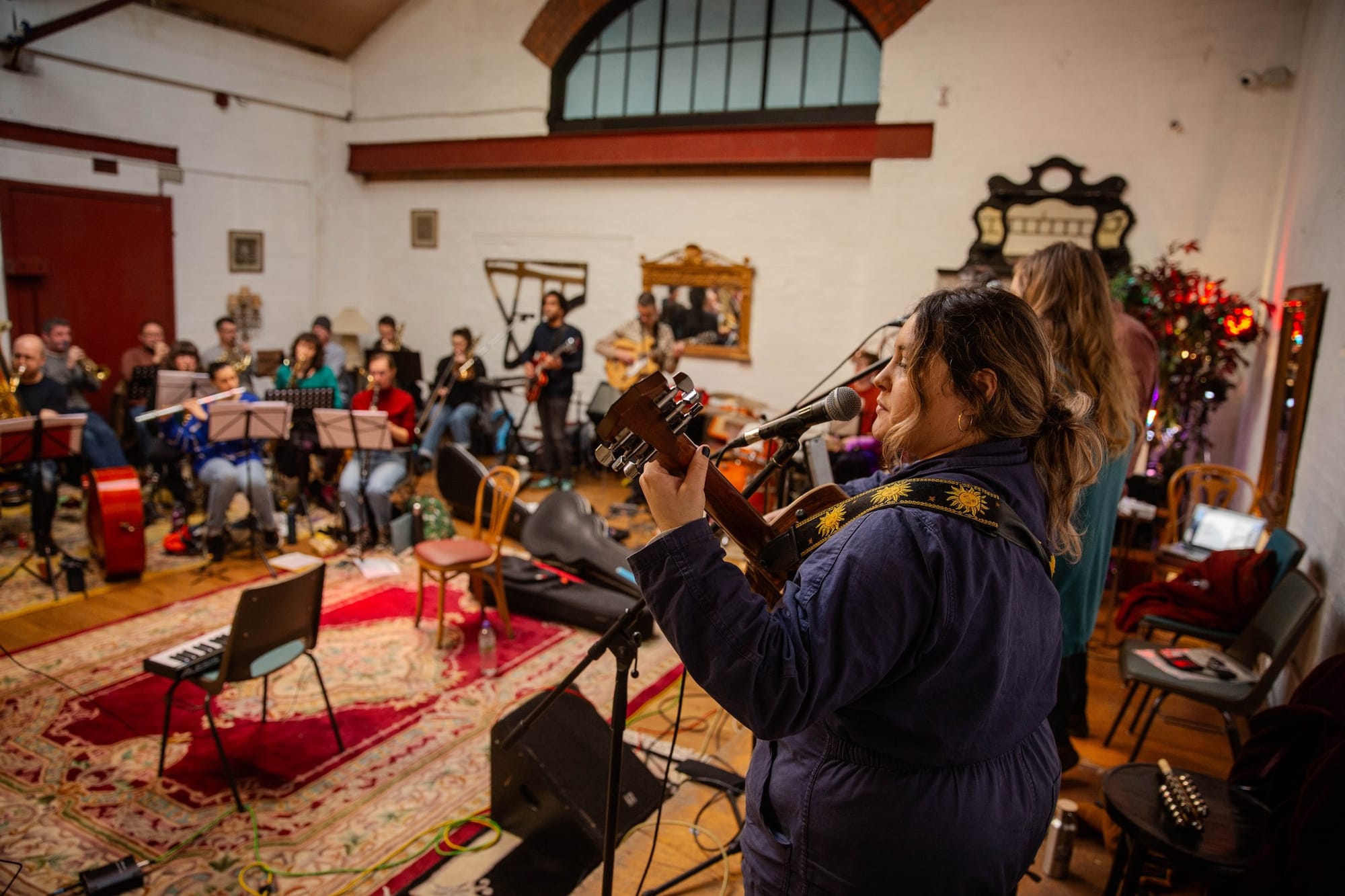 In a spacious room at Yellow Arch Studios in Neepsend, it’s the final rehearsal with the nine members of the core band: four singers, two guitarists, a bassist, a drummer, and a keys player. On Sunday, 21 more people will be added to the mix when the full orchestra arrives. In breaks between songs some of the band grumble about the acoustics not being great, but it looks the part. Ornate gold mirrors adorn the walls while two huge Persian rugs cover the floor. It feels like a room that The Beatles could once have used themselves.