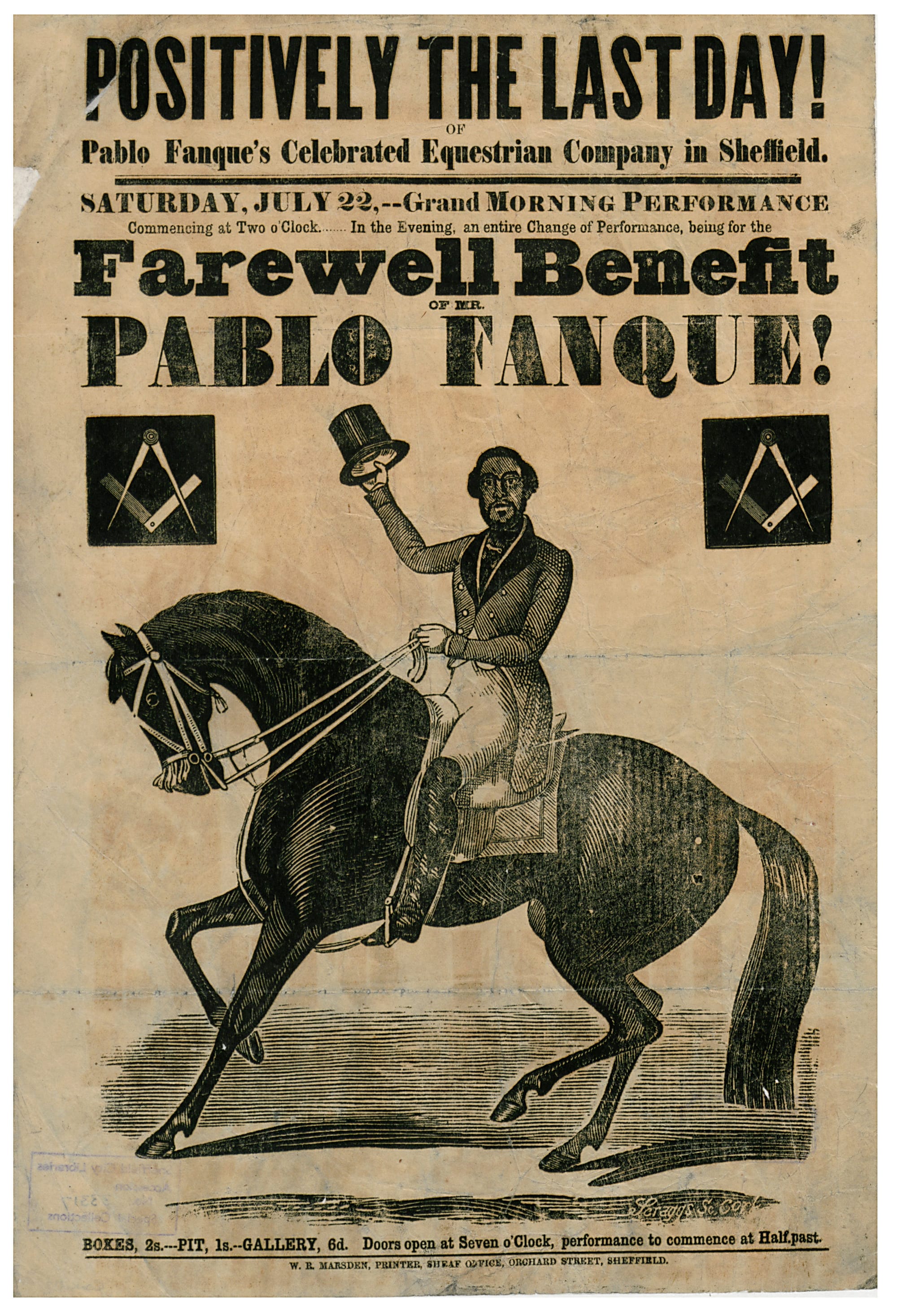 In the Sheffield archives Professor Toulmin found one of the only images of him which survives from this time, on a bill poster advertising his “farewell benefit performance” in 1854. In the poster Pablo has a distinctive, almost Georgian-style hairstyle. He is also wearing a ringmaster outfit of the kind that would later become synonymous with circus shows but at the time was relatively new. The show took place at the Cattle Market on Furnival Road on July 22, 1854. Records show that he carried on performing in Sheffield for two years after this but following that time, his association with the city seems to end.