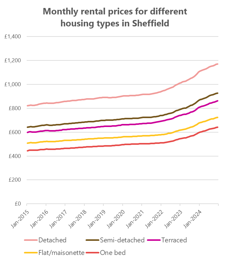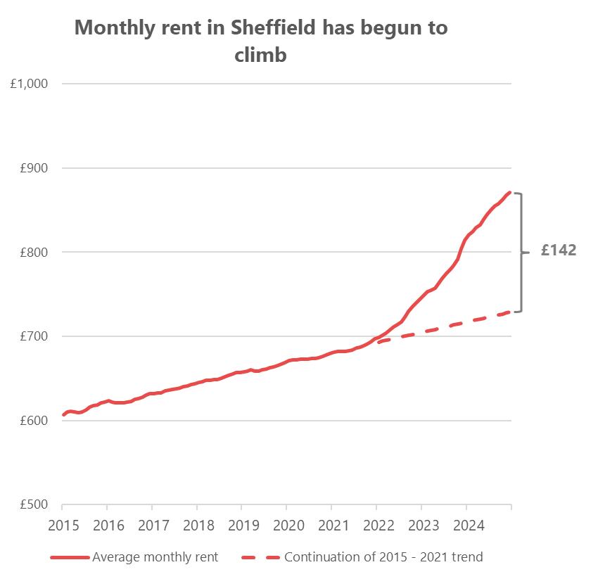 When you look at the graph, there’s clearly a moment where the line bends, around March 2022. Before this, rents were going up by about £12 a year. But in the summer of last year, average rents hit £855: £76 higher than it had been a year before. That rate of growth has since cooled off a bit, but clearly Sheffield’s rental market is a very different beast to what it was before Spring 2022. In fact, had the trend from 2015 to 2021 continued, rents would be almost £150 lower per month than they are now.