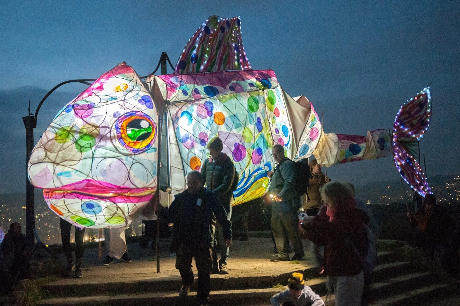 The Parkwood Springs annual lantern festival is always a brilliant event. As the sun set on Saturday, dozens of beautiful lanterns made of willow sticks and papier-mâché were paraded to the beauty spot overlooking the city, accompanied by two samba bands and a fire juggler. The large fish pictured above by photographer Tim Dennell opened up to become a mobile shadow puppet theatre. For many more photos from the event, see his Facebook page.