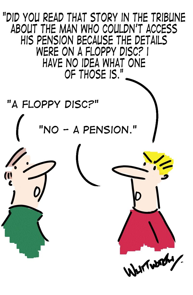Cartoonist James Whitworth with his take on our story from last week about a destroyed floppy disk and Ian Stocks’ missing South Yorkshire County Council pension.