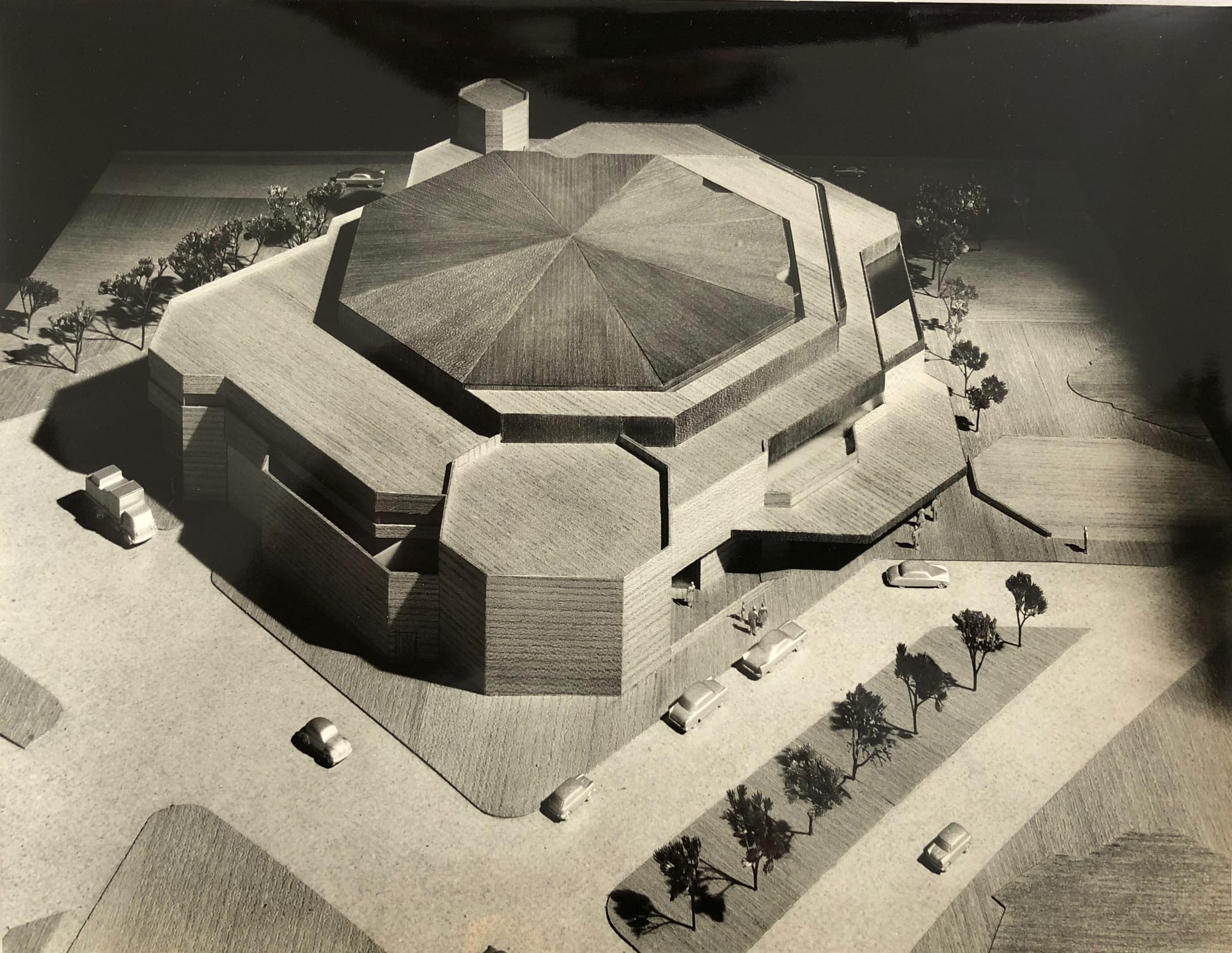 After much discussion it was decided that the new theatre would have a “thrust” stage, in which the actors are surrounded by the audience on three sides. Theatres had been designed using a traditional “proscenium arch” design (where a stage sits at the front of an auditorium with banks of seats facing it) for hundreds of years. But in the postwar period new theatre designs sought to bridge the gap between actors and audience.