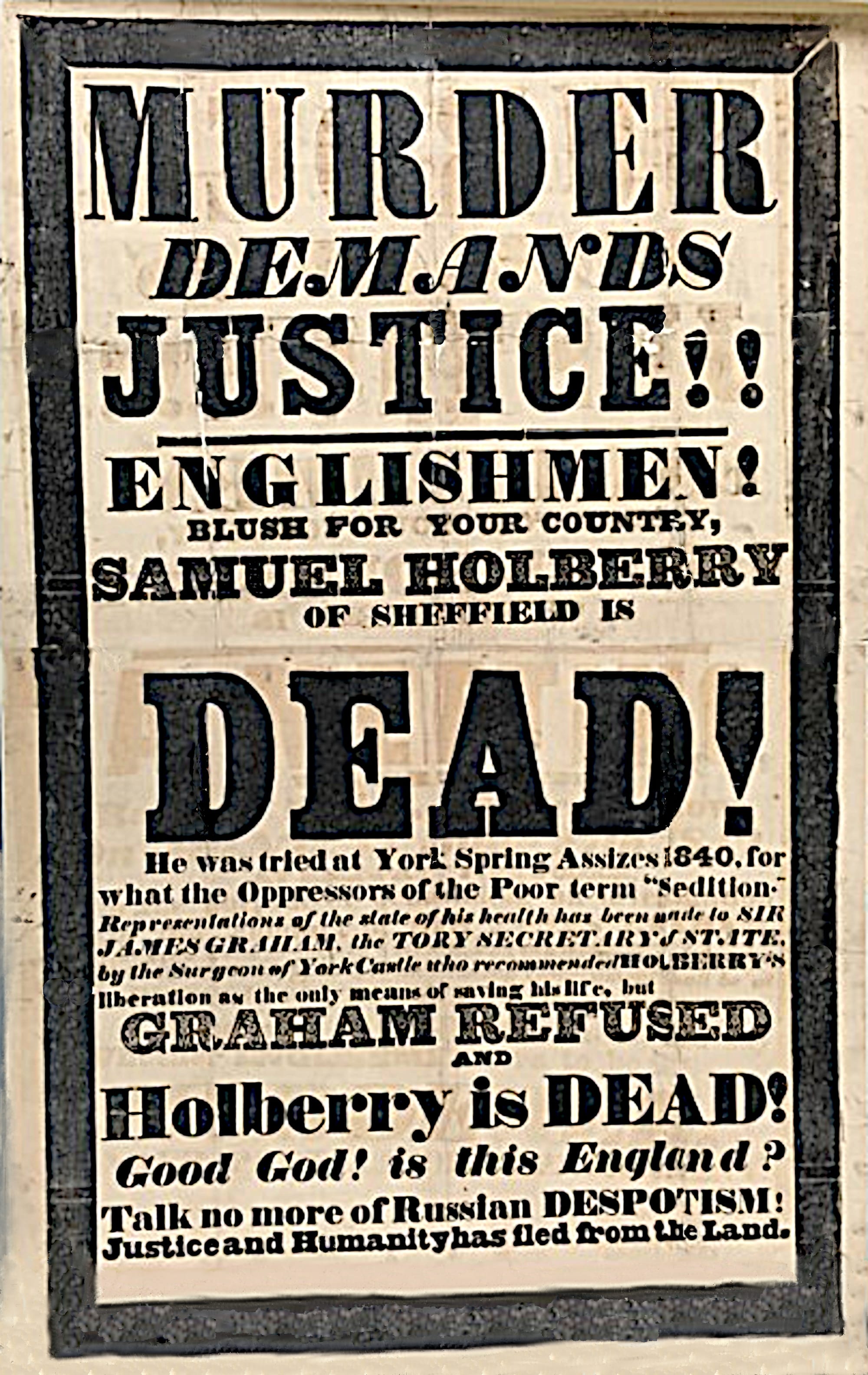 Rather than silencing his voice, however, Holberry's death gave the Chartist movement a martyr. “Murder demands justice. Englishmen! Blush for your country,” read one bill poster produced after he died. “Talk no more of Russian despotism. Justice and humanity has fled from this land.” At his funeral on 27 June, 50,000 people lined the streets of Sheffield all along the cortège route from Attercliffe to Sheffield General Cemetery in Sharrow. In their report from the funeral, the Northern Star, a Chartist newspaper published in Leeds, wrote: