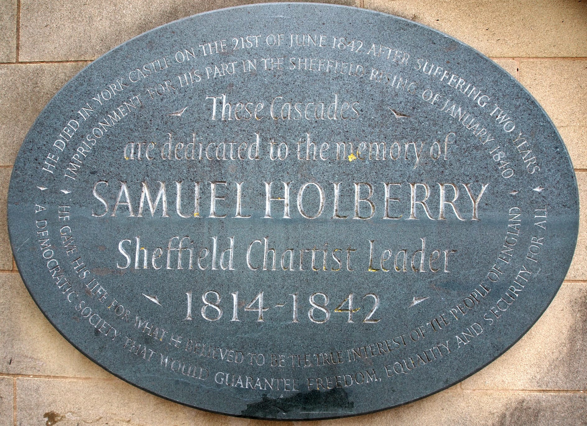 It would take another 50 years for the demands of the Chartists to be met, and almost another century until the advent of universal suffrage. By that time Holberry had been largely forgotten, but a handful of people kept his flame alive. A Holberry Society set up in 1978 was the driving force behind the renaming of several streets and spaces in Broomhall after him in 1982 (Holberry Gardens, Holberry Close etc). 20 years later, the fountains at the newly redesigned Peace Gardens were named the Holberry Cascades. An inscription on them reads: “He gave his life for what he believed to be the true interest of the people of England. A democratic society that would guarantee freedom, equality and security for all.”