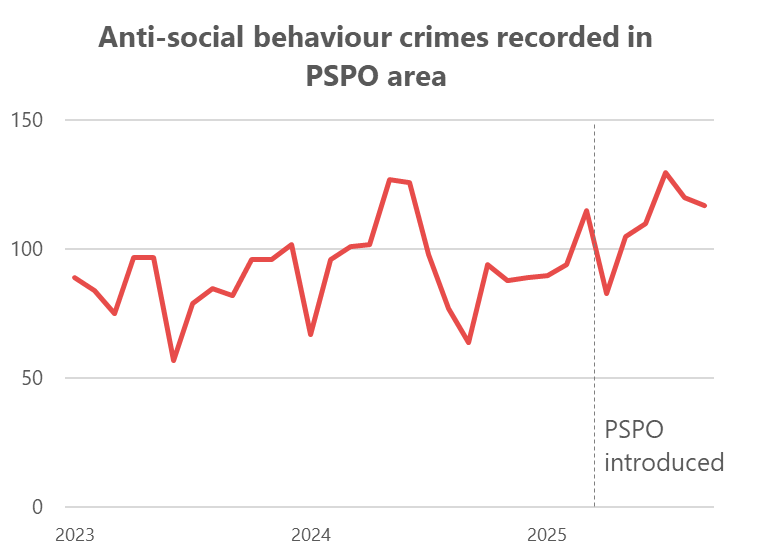 We wrote that: “we’ll say this has succeeded if the monthly police data shows a clear decrease in anti-social behaviour incidents in the city centre following its introduction.” We can answer that question with a high level of precision, because police crime data is logged to exact co-ordinates. It hasn’t happened — if anything, the number of incidents has gone up, though that may also be linked to increased reporting.
