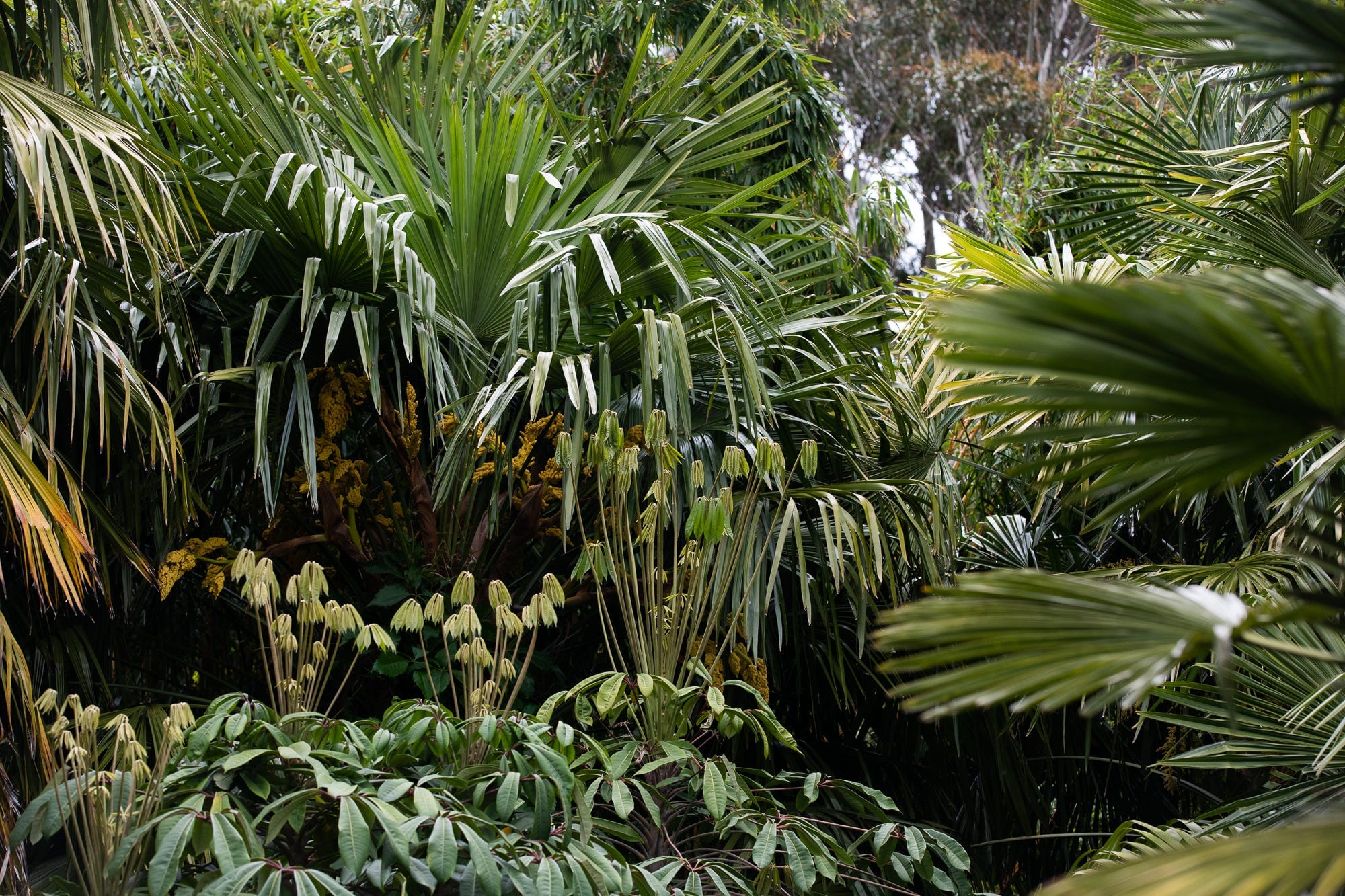 Of the palms, there are around 45 large ones with trunks ranging from a short and stubby three feet to an imposing 20 feet. Many are giant versions of the first plant he bought for the garden back in 1987: an 18-inch tall Chinese windmill palm. Most of these are covered in an incredibly tough fibre, which Simon tells me used to be weaved into weatherproof hats and coats by the inhabitants of places the palms originally came from. The leaves too have been used for anything from woven baskets to roof thatch.