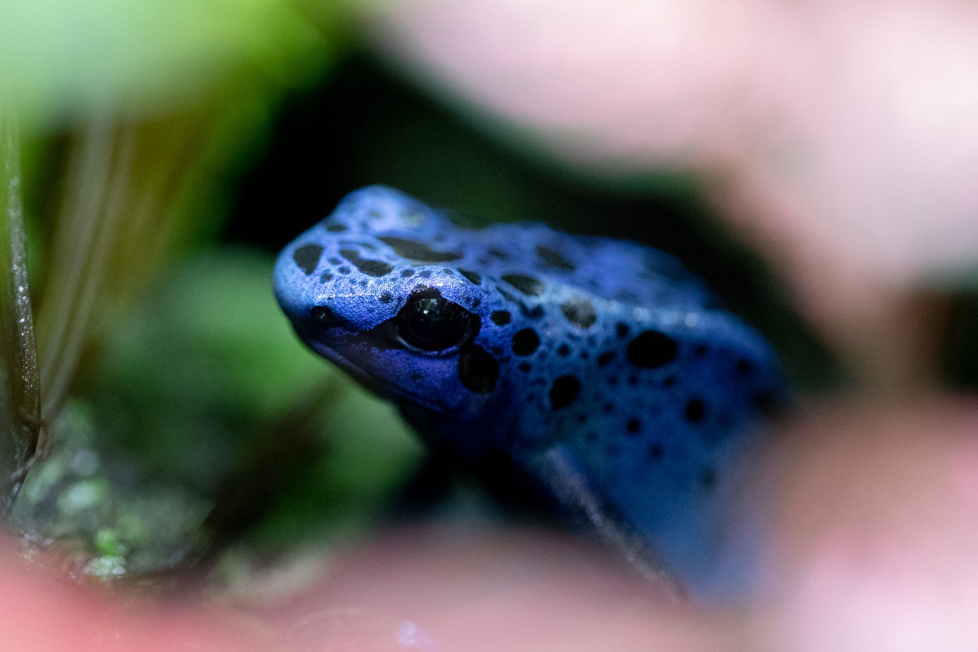 As we walk back into the house from the jungle garden, we stop to inspect two slightly scary-looking vivariums, filled with exotic plants. Inside are dart frogs, some blue and some emerald, which Simon breeds. These tiny creatures, some no bigger than your fingernail, are so-called because some of their species’ skin secretions are used to create poison darts in Central and South America (although these ones are completely harmless).