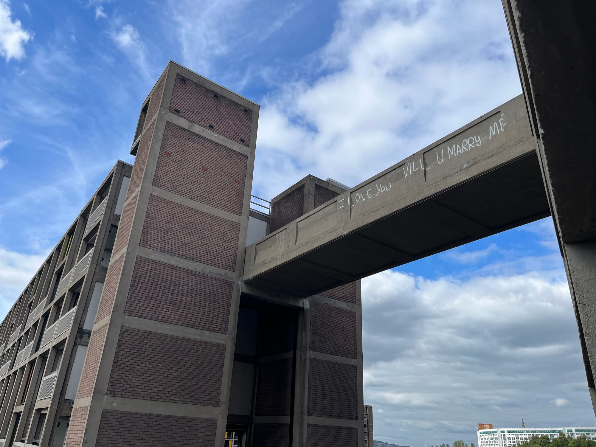 - Great news that Park Hill flats’ famous “I Love You, Will U Marry Me” graffiti is back in pride of place. The graffiti was removed in 2021 to allow the concrete bridge to be fully renovated, but was put back exactly as it used to be on Monday by a specialist team. The work was completed in the presence of Jason Lowe: the person who originally painted it in 2001. The message was originally to his then-girlfriend Clare Middleton, who sadly died from cancer at the age of just 30 in 2007 (this Guardian article explains the full story). At the moment the slogan is just painted on but it is understood that the neon lights that were there before will be added soon. Thanks to resident Sophie Jo-Anna Walker for the below photo.