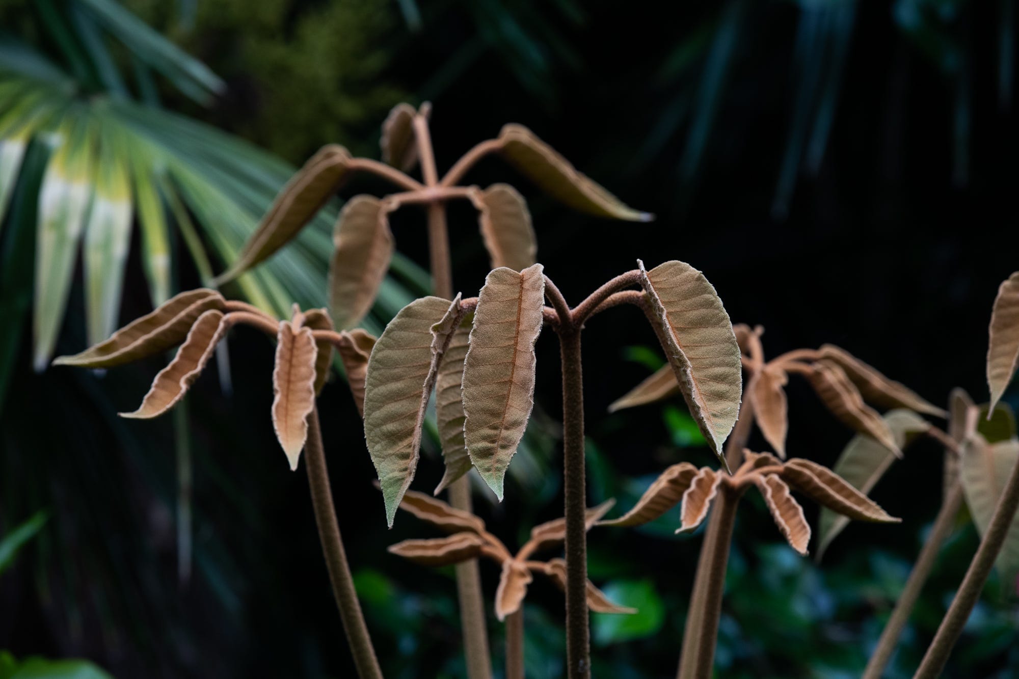 Also prominent are scheffleras or umbrella plants. These will be familiar to many gardeners and are also commonly used as houseplants — but Simon’s looks like something out of The Day of the Triffids. The central stamen of one looks strangely and mysteriously sentient. It’s differently coloured than the normal leaves and has a furry texture. Simon says it will eventually fall down to look like the others, but I silently hope I’m not here when it does.