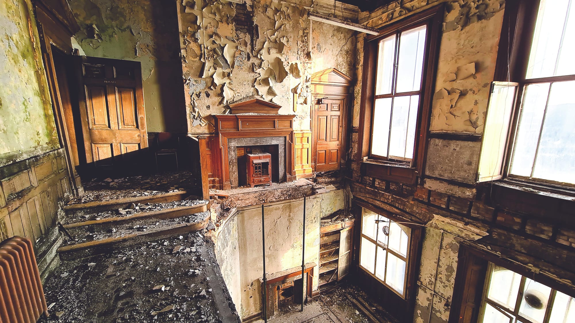 The Old Town Hall is rotting from the inside out: we see the grand judge’s quarters, its floor completely missing. A fireplace hangs suspended in mid air halfway up the wall. This isn’t a fever dream, but a photo taken by an urban explorer published in the book Sheffield in Ruins.